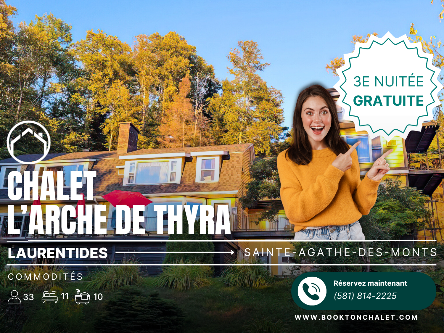 Séjournez à L'Arche de Thyra, niché au cœur des Laurentides à Sainte-Agathe-des-Monts. Profitez de vues panoramiques époustouflantes sur le lac des Sables et admirez les couchers de soleil les plus spectaculaires depuis le sommet de la colline. Avec une capacité d'accueil allant jusqu'à 33 personnes, ce chalet est parfait pour les réunions de famille, les vacances entre amis ou les retraites d'entreprise.